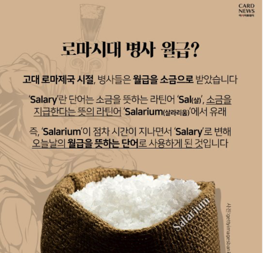 로마시대에 공무원의 봉급을 소금으로 지급했는데 . 이를 라틴어로 ’salarium’이라고 했습니다.