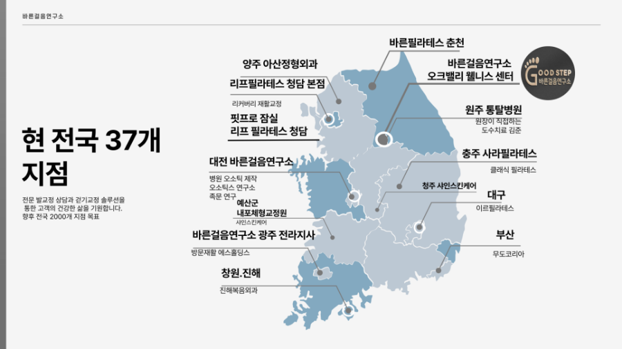 저희 연구소는 현재 전국 37개 지점에서 병원, 필라테스 센터, 재활센터 등과 협력하며 의사, 물리치료학교수, 필라테스 마스터 같은 각 분야 최고의 전문가들과 함께하고 있습니다. 지난 10년 동안 3만 족의 데이터를 수집하고, 1만 명 이상의 체형 교정 사례를 만들어왔습니다. 저 개인적으로도 4,000명이 넘는 임상 경험을 가지고 있습니다.
