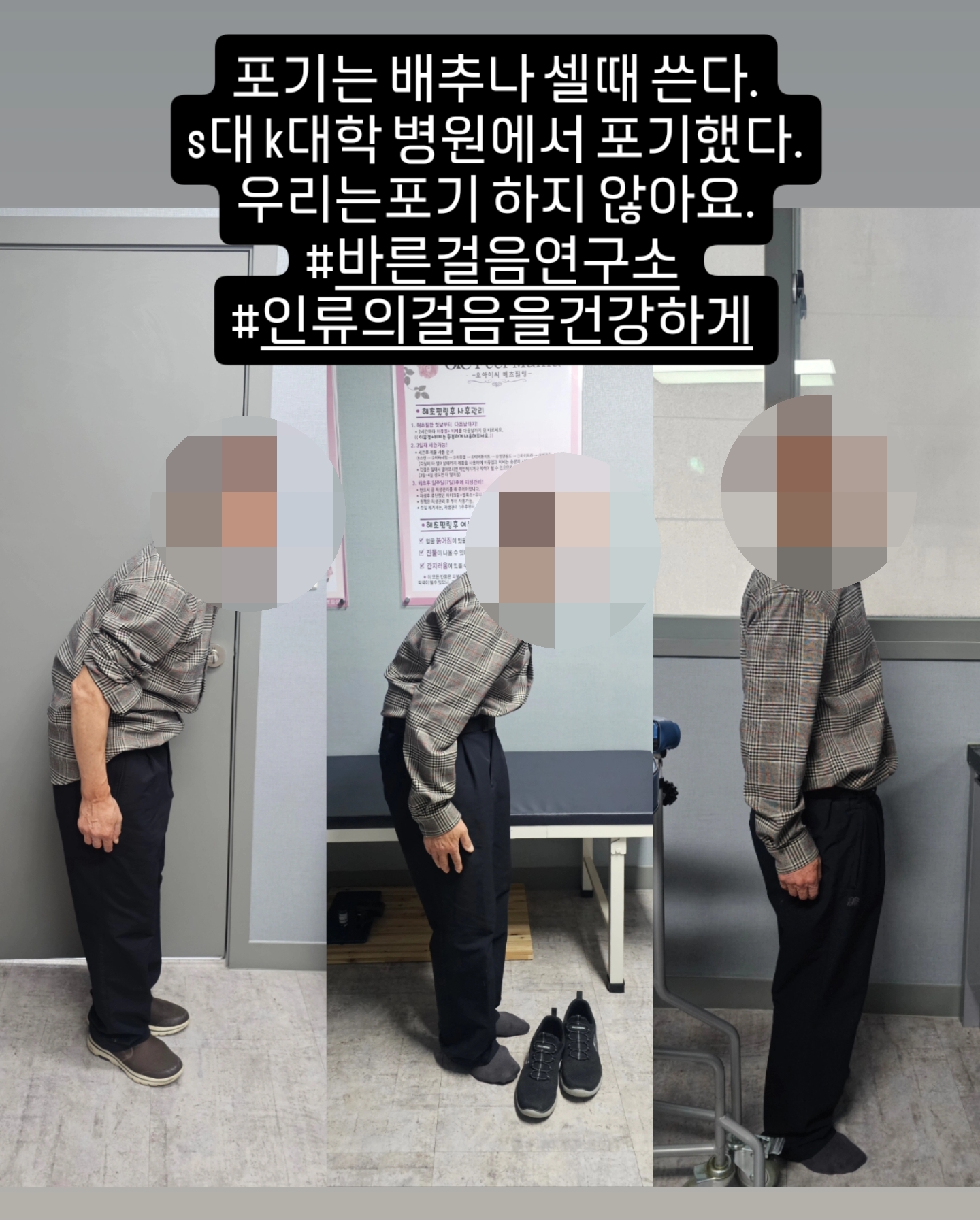 이분은 공직자 생활을 하시다 은퇴한 70대 고객님이셨습니다. 10년 전부터 허리가 점차 굽어지기 시작해 처음 내원하셨을 때는 허리가 완전히 90도로 굽은 상태로, 땅만 바라보며 걷는 모습이셨습니다.